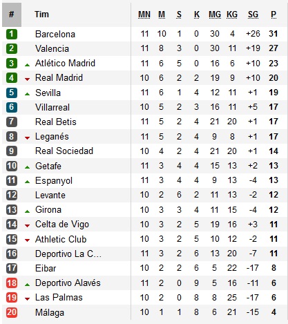 Dipekan ini barcelona masih memimpin dipuncak klasemen, disusul sevilla fc diposisi kedua dan valencia di urutan ketiga top skor liga spanyol. Lionel messi (barcelona) 23 gol: